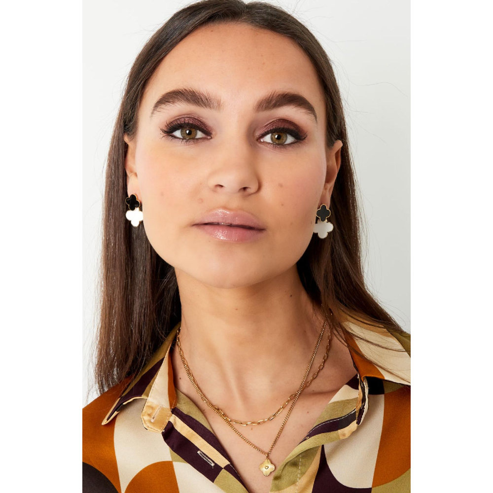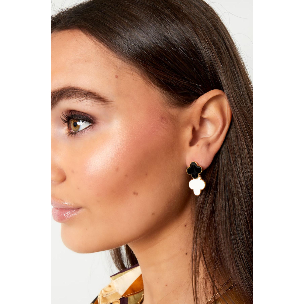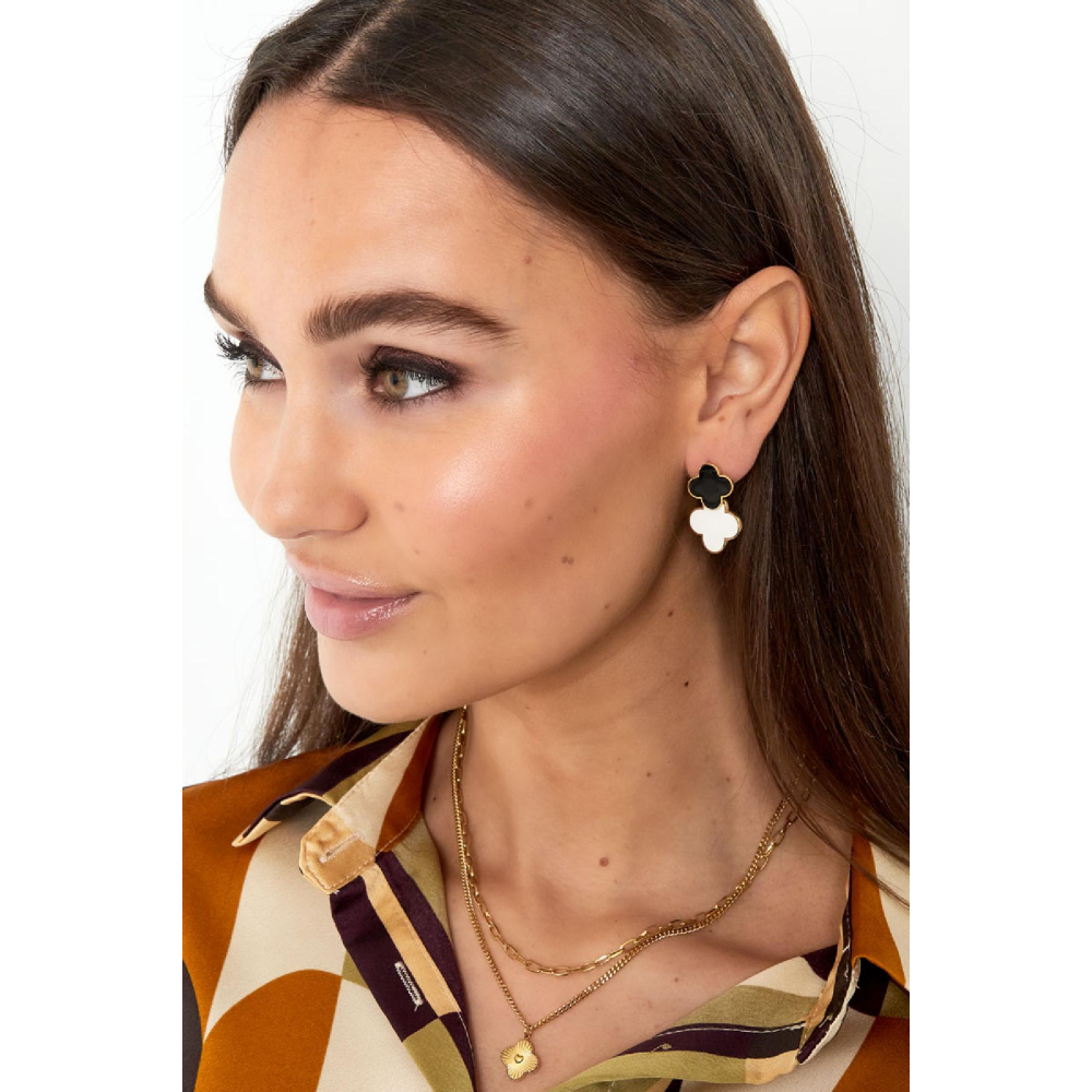 Hoe leuk zijn deze prachtige oorbellen met 2 grote klavertjes in de kleuren zwart en wit. Deze prachtige statement oorbellen maken jouw look helemaal compleet! De oorbellen zijn gemaakt van Stainless Steel in combinatie met enamel en hebben een afmeting van 2,8 cm.