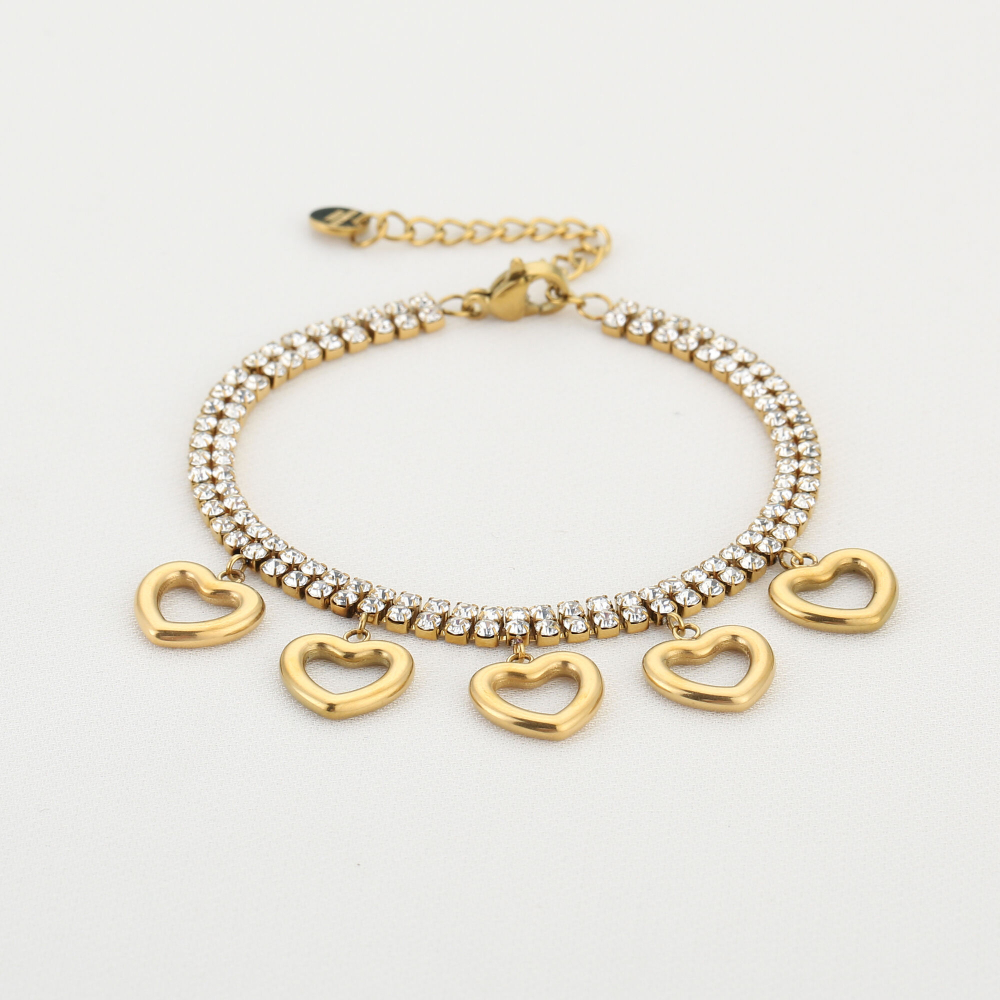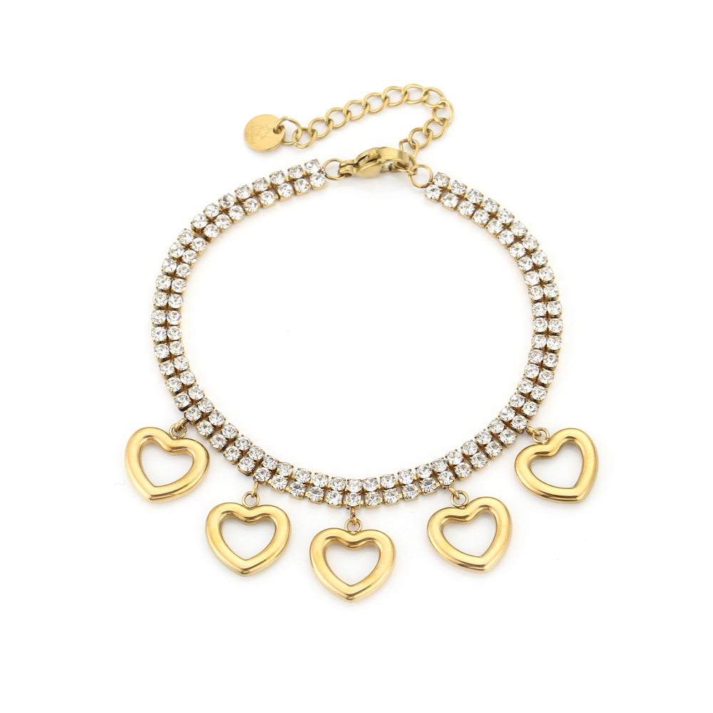 Armband met strass in goud kleur en hartjes bedel van stainless steel
