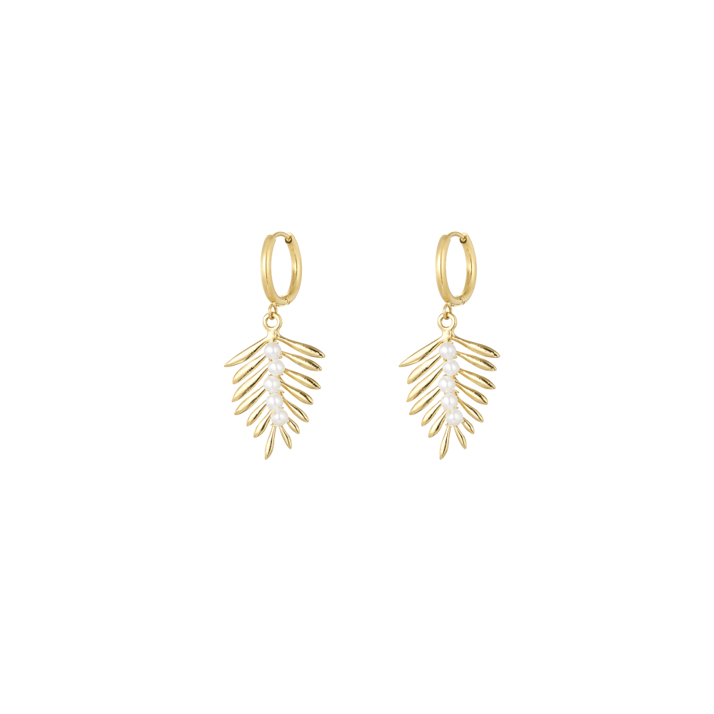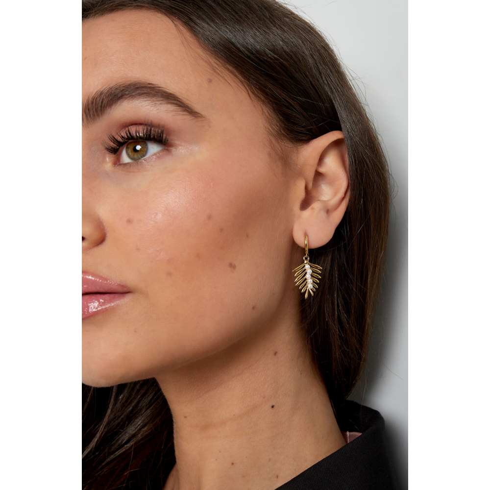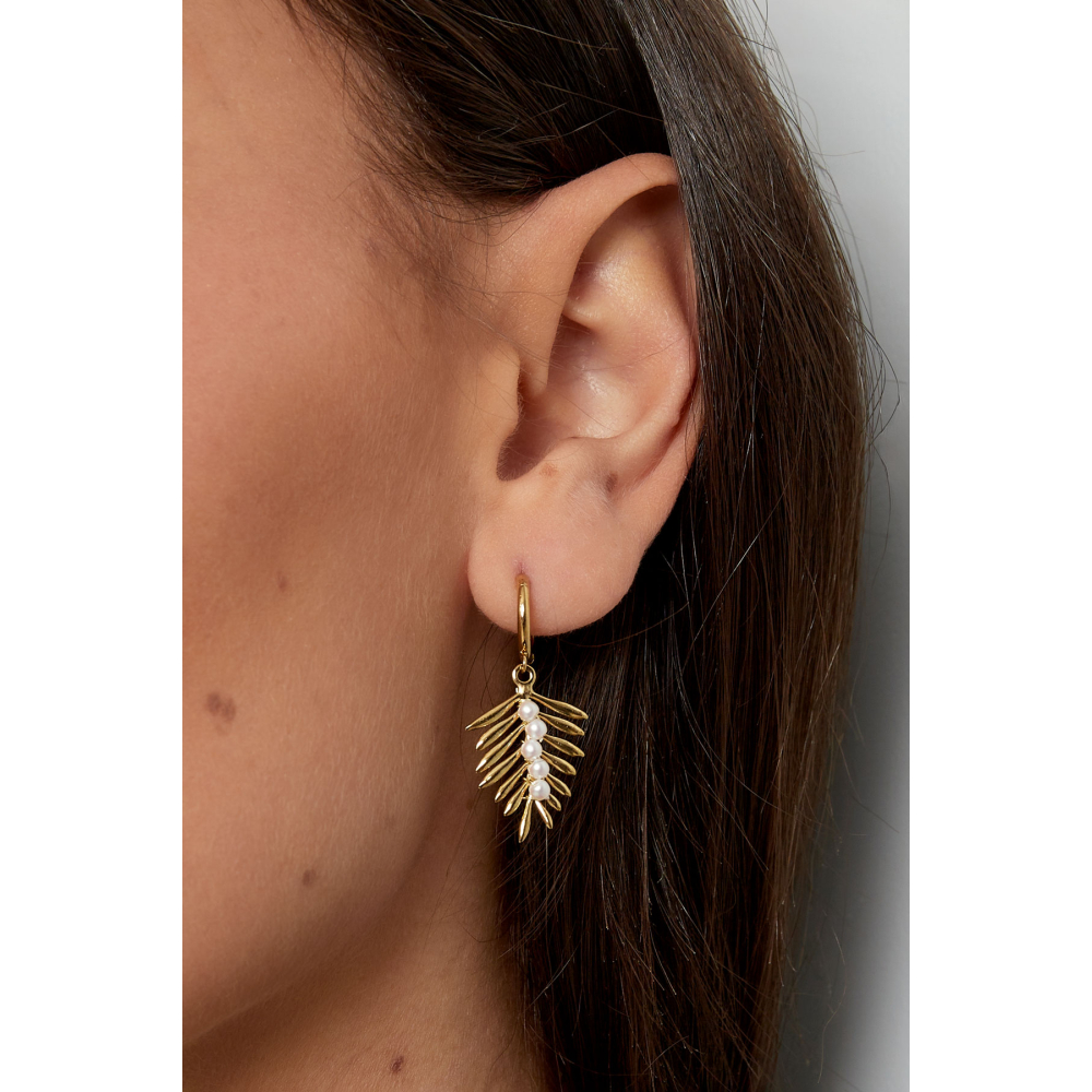 Oorbel met veren detail en parels in goud kleur van stainless steel